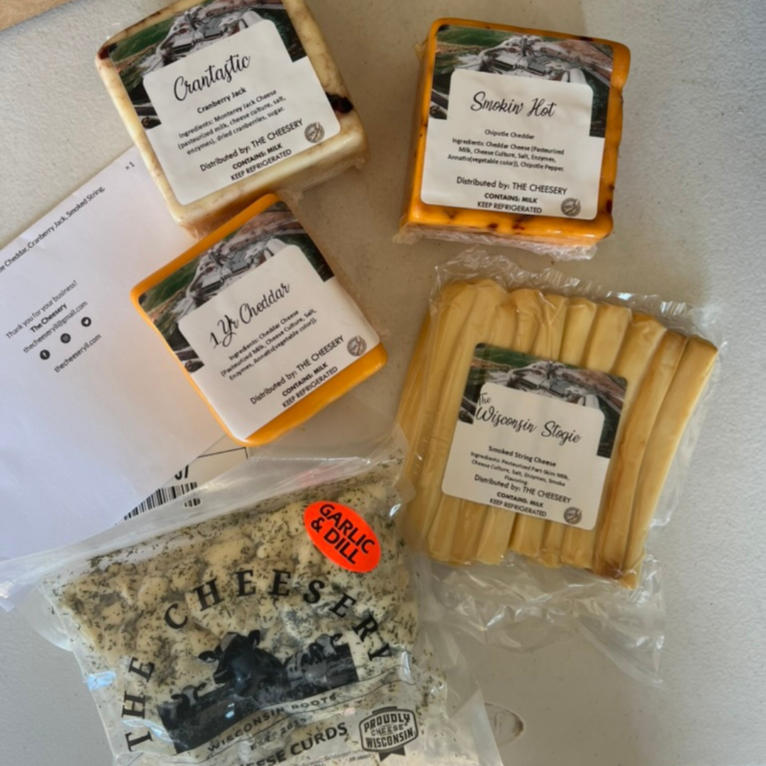 New this year! We are offering a pre-selected 5-item Christmas gift box! This box will contain 3 blocks of cheese, 1 package of string cheese & one flavored curd! Take the pressure off picking the flavors & just send the gift of cheese (even to yourself ;) )!